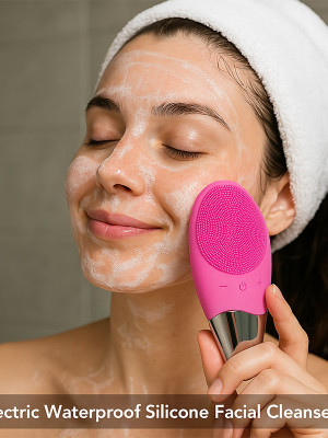 Electric silicone facial brush with sonic vibrations, waterproof design, and rechargeable battery for deep, gentle cleansing.